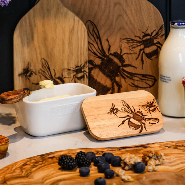 Wood and ceramic butter, engraved in Scotland. In a choice of colour with varying adorned designs. Perfect for gifting or adding to your home decor.