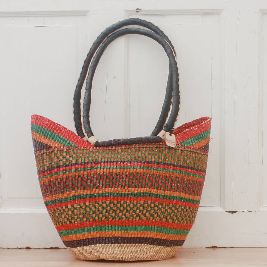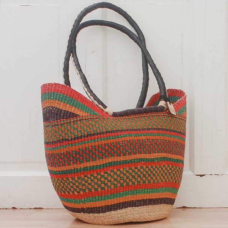 This two handled basket was designed for the western market and is considered in Ghana to be a more modern style of Bolga basket. It is a perfect market basket with a wide mouth and deep bottom, it holds-well-a lot of stuff! It measures approximately 13 inches at it's tallest and approximately 18 inches at it's widest (really, we mean approximately).